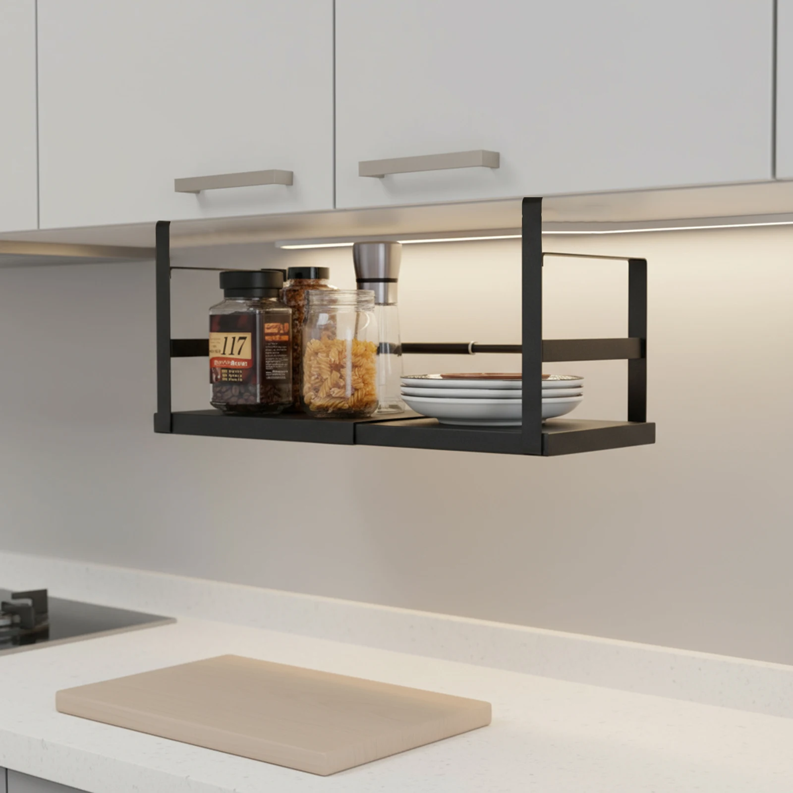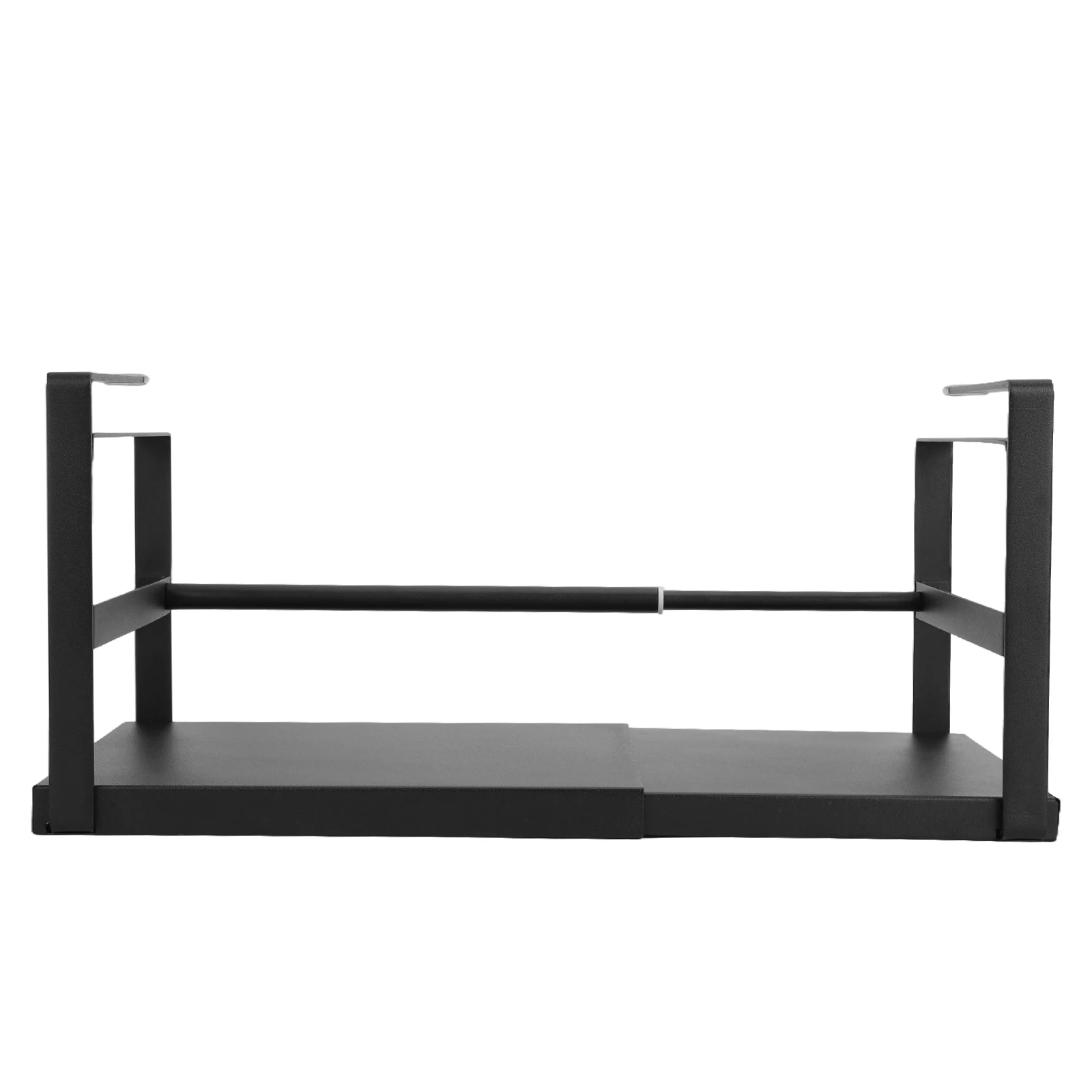 Features: 1.Easy Installation: No drilling or nails needed. The hook design of the expandable cabinet organizer shelf ensures hassle-free and secure setup, saving you time and effort. Effortlessly upgrade your storage solutions in minutes. 2.Space-Saving Design: The hanging style of this retractable storage shelf maximizes storage space and keeps your area tidy and organized. Ideal for making full use of unused spaces in your home. 3.Adjustable Shelf Storage: The retractable kitchen rack features an extendable shelf to meet various kitchen storage needs. Easily store seasoning bottles, bakeware, or pans and customize your layout as needed. 4.Long-Lasting and Sturdy: Crafted from carbon steel, the seasoning bottle storage rack provides stable support and resists deformation. Strong load-bearing capacity allows for convenient storage of various items in most cabinets. 5.Versatile Use: Suitable for kitchens, closets, shoe cabinets, and more, this expandable under shelf storage rack is an ideal choice for organizing different spaces in your home with ease. Specification: Surface treatment: baking paint (black sand pattern) Shelf classification: Inside the cabinet Material: carbon steel Attributes: Retractable cabinet hanger Product specifications: Telescopic hanger A black Product size: scalable length 270- 450mm; width 220mm Function: multi-purpose, removable, installation-free Maximum load-bearing weight: 7kg Warm reminder: The thickened version does not come with a base hanging piece
