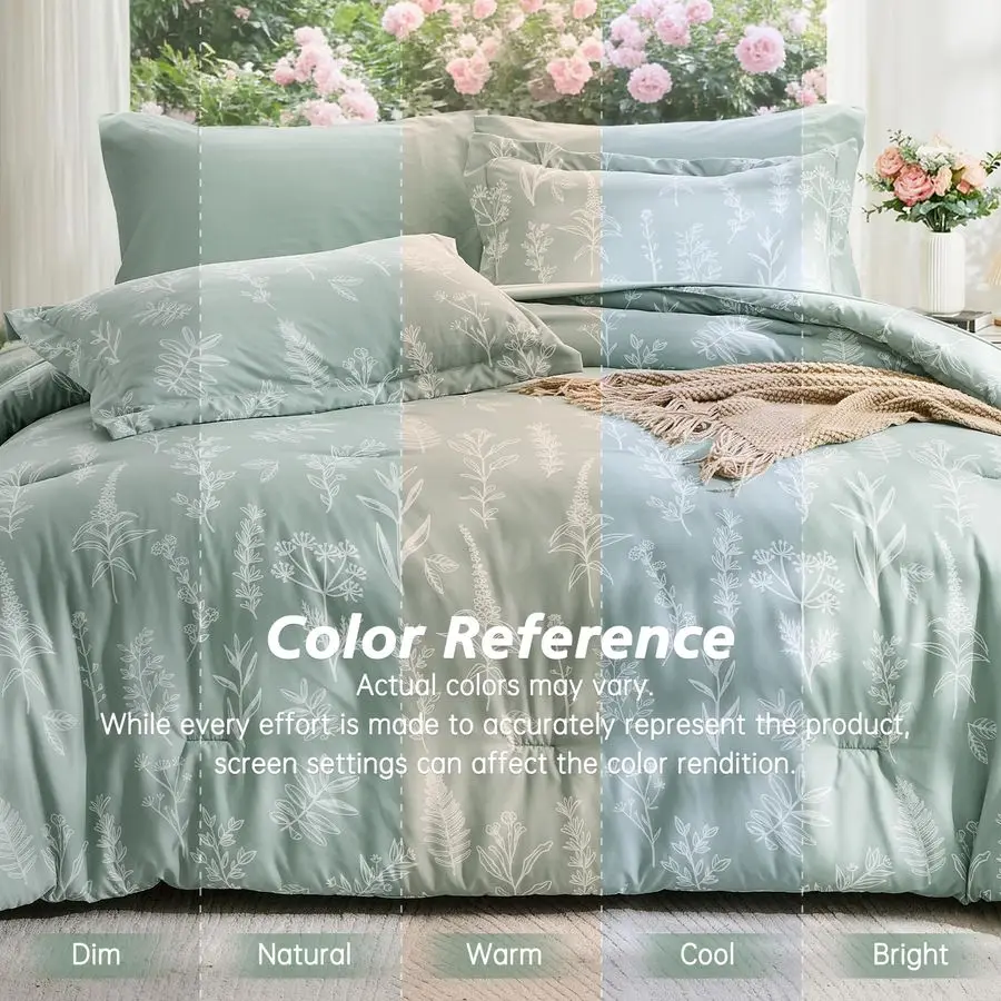 Queen Comforter Set 7 Pieces, Sage Green Bed in a Bag Queen Reversible Botanical Flowers Design, Ultra Soft amp Breathable Beddi